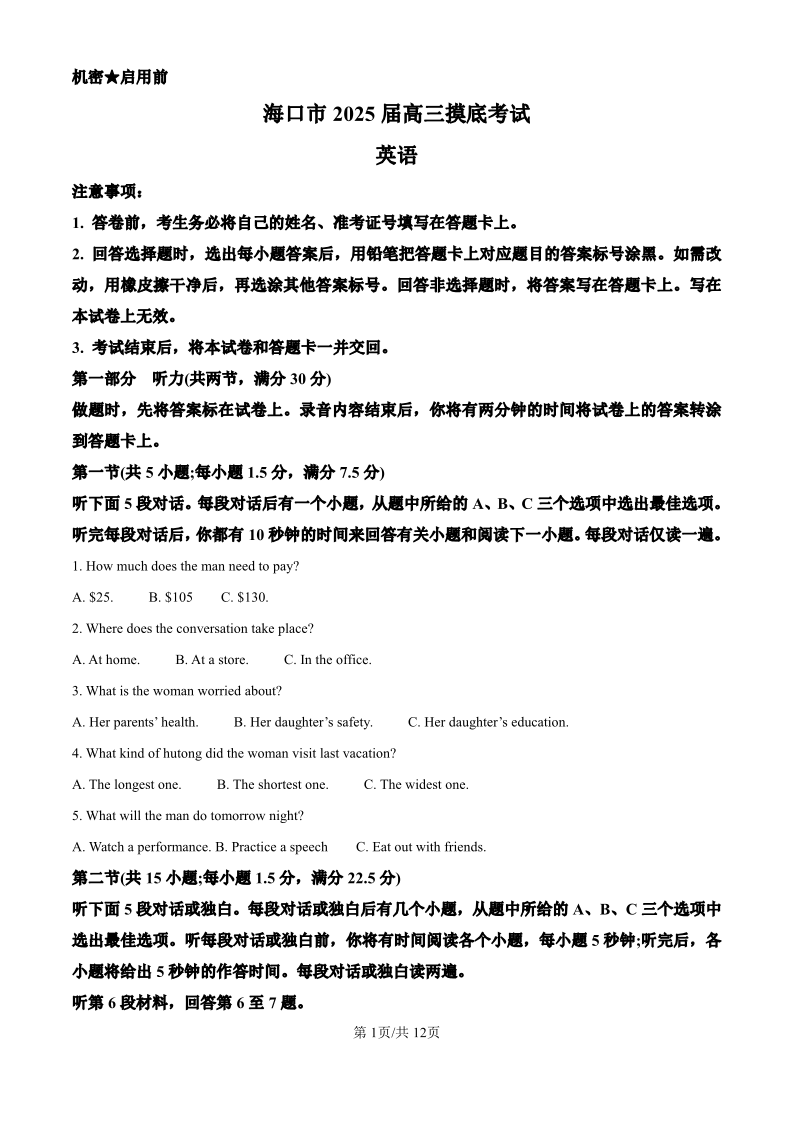 海南省海口市2025届高三上学期10月摸底考试英语(原卷版)