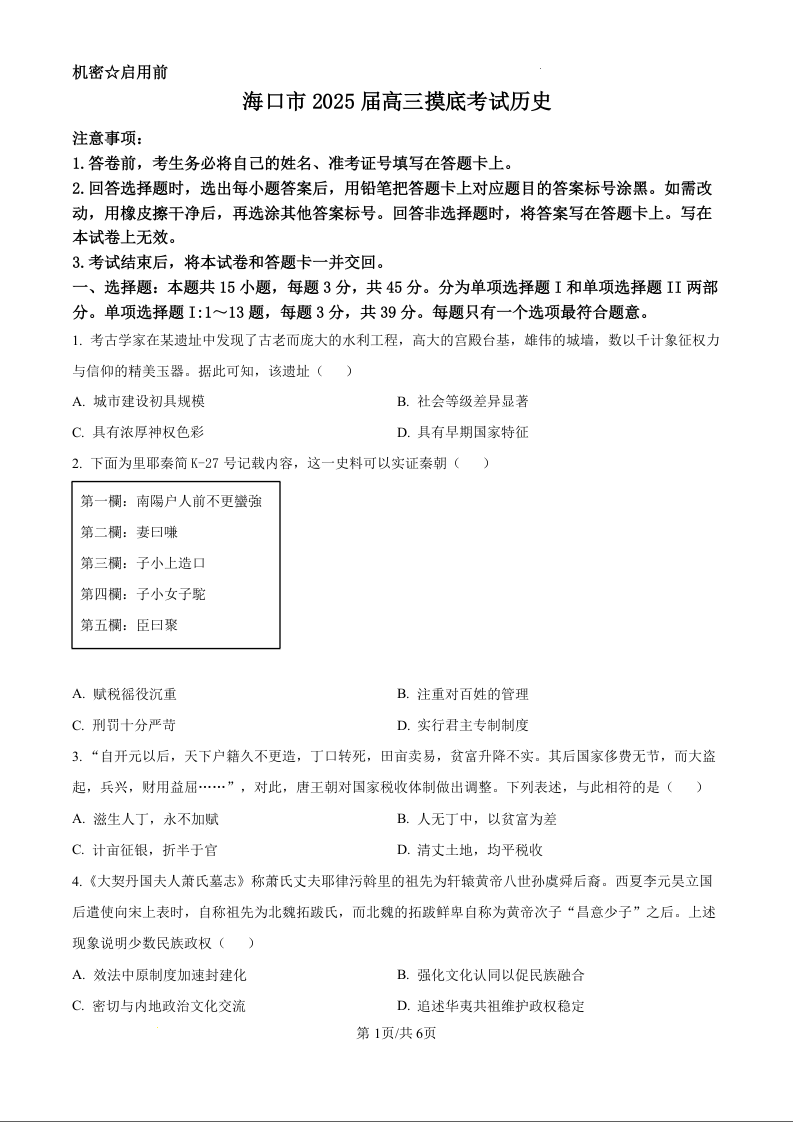 海南省海口市2025届高三上学期10月摸底考试历史(原卷版)