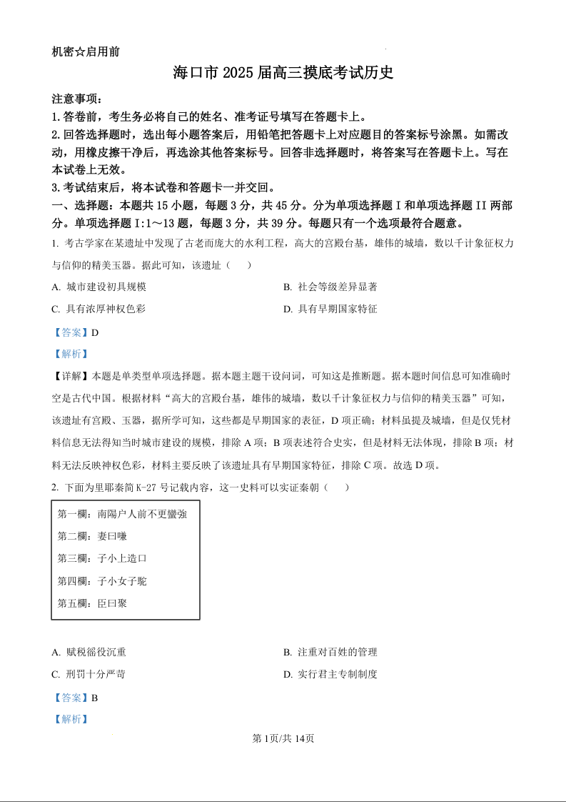 海南省海口市2025届高三上学期10月摸底考试历史(精品解析版)