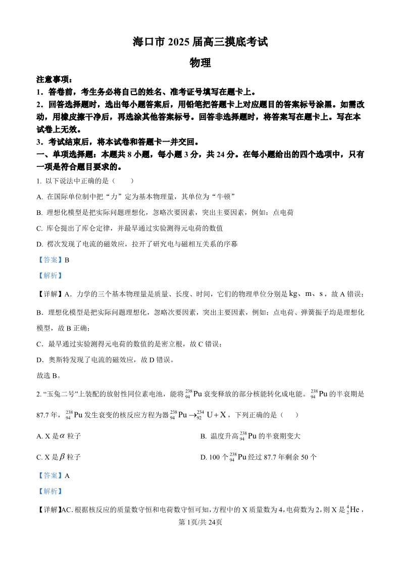 海南省海口市2025届高三上学期10月摸底考试物理(精品解析版)