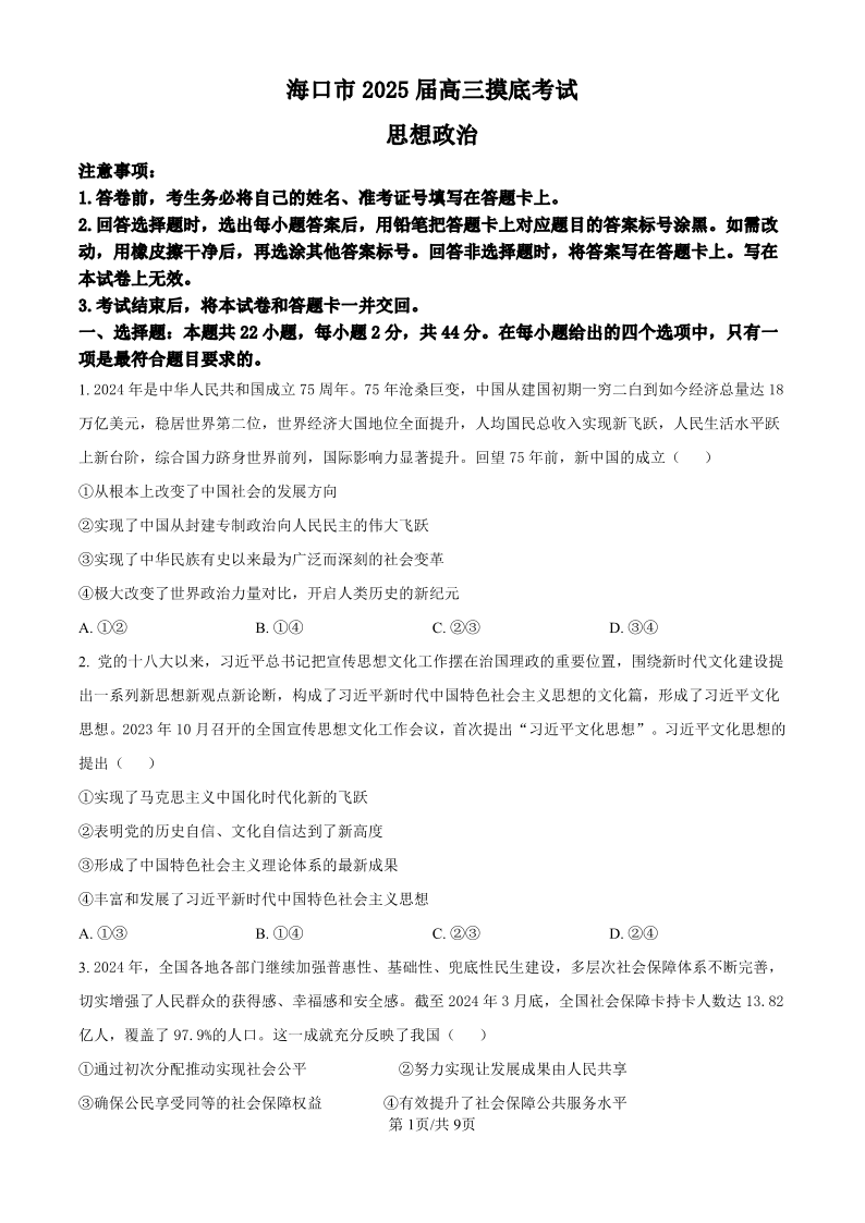 海南省海口市2025届高三上学期10月摸底考试政治(原卷版)
