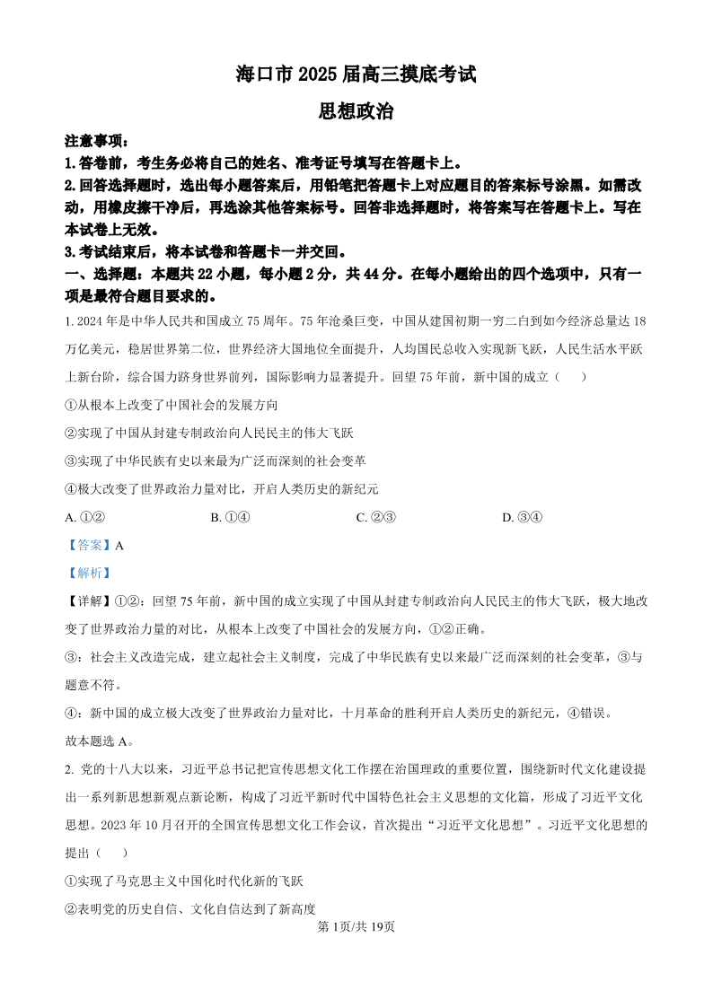 海南省海口市2025届高三上学期10月摸底考试政治(精品解析版)