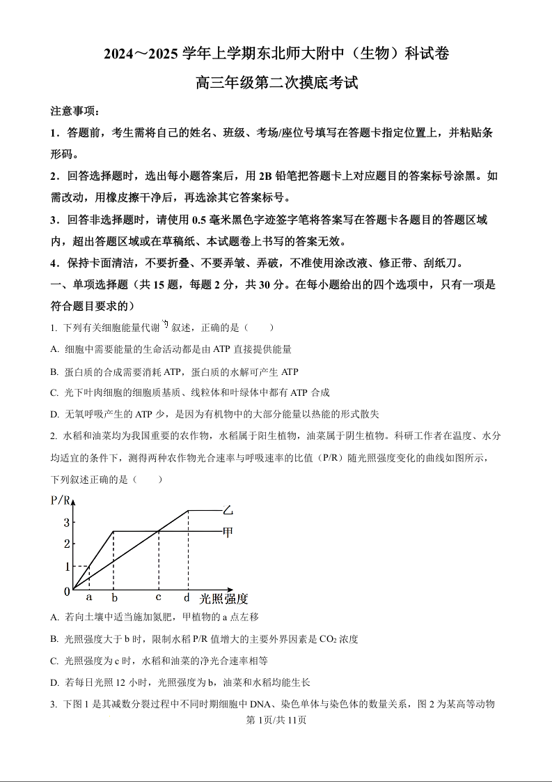 吉林省东北师范大学附属中学2025届高三上学期第二次摸底考试生物(原卷版)