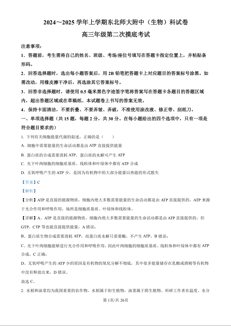 吉林省东北师范大学附属中学2025届高三上学期第二次摸底考试生物(精品解析版)