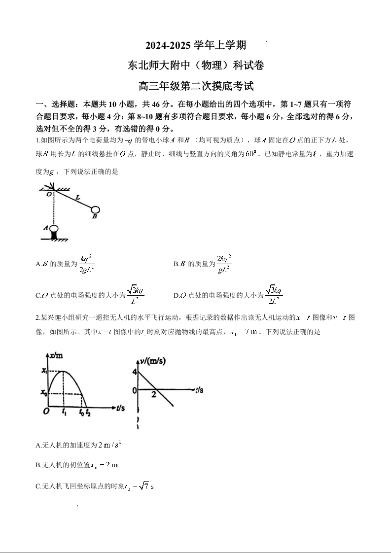 吉林省东北师范大学附属中学2025届高三上学期第二次摸底考试物理