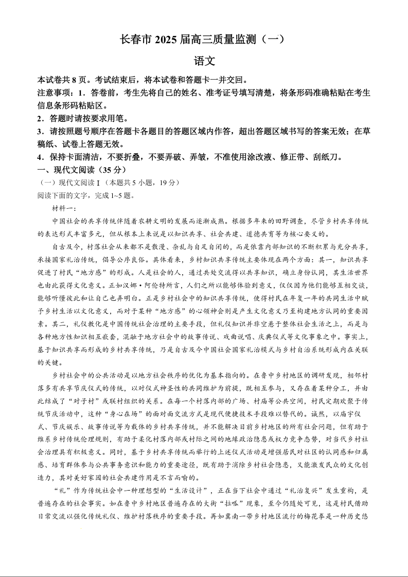 吉林省长春市2025届高三上学期质量监测(一)语文+答案