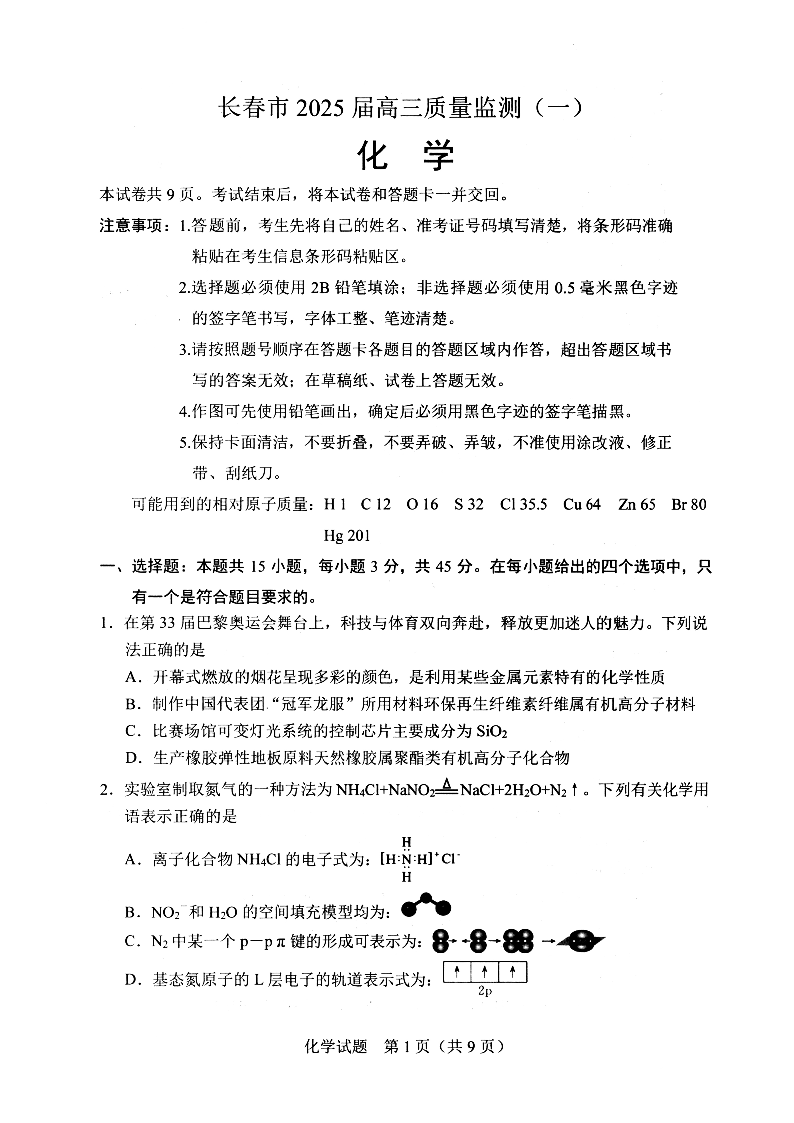 吉林省长春市2025届高三上学期质量监测(一)化学