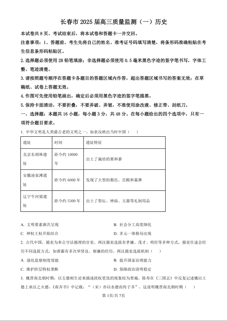 吉林省长春市2025届高三上学期质量监测(一)历史(原卷版)