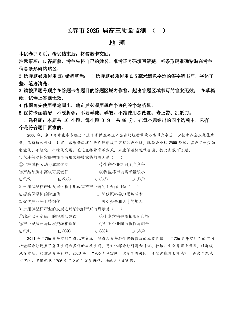 吉林省长春市2025届高三上学期质量监测(一)地理+答案