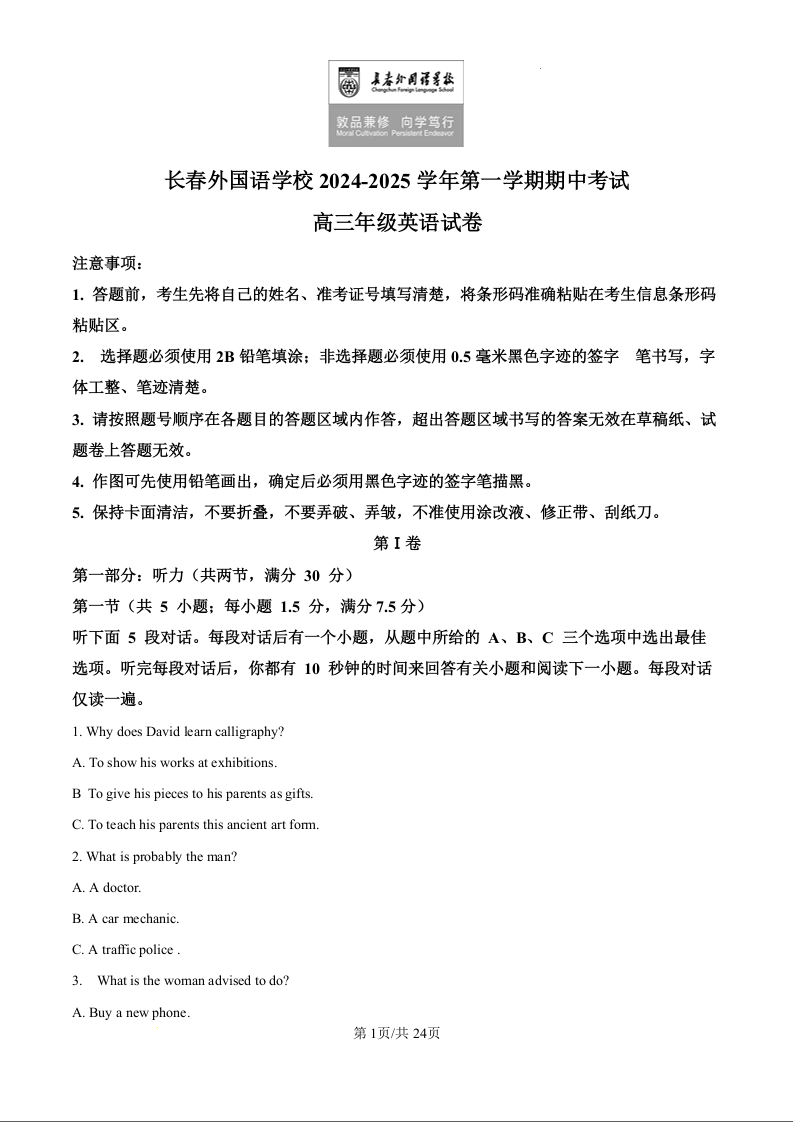 吉林省长春市外国语学校2025届高三上学期期中考试英语(精品解析版)