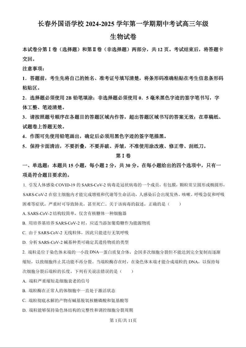 吉林省长春市外国语学校2025届高三上学期期中考试生物(原卷版)