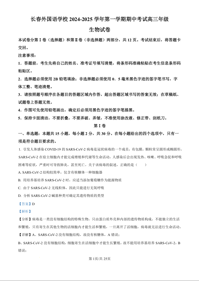 吉林省长春市外国语学校2025届高三上学期期中考试生物(精品解析版)