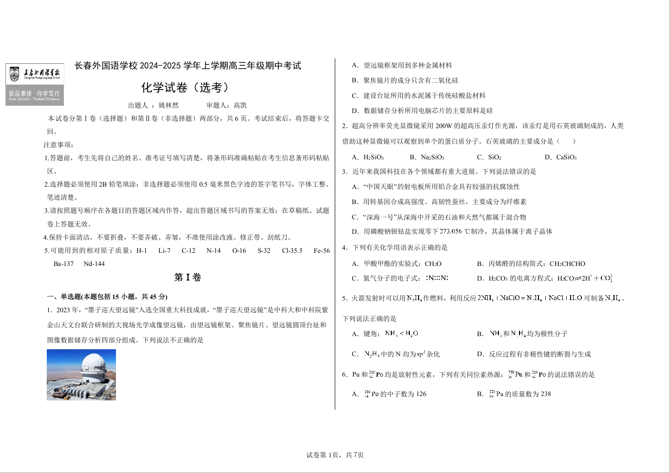 吉林省长春市外国语学校2025届高三上学期期中考试化学+答案