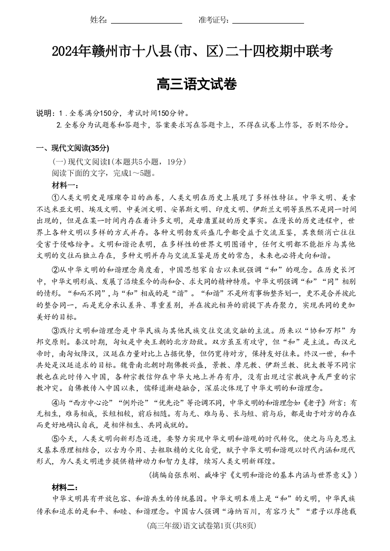 江西省赣州市十八县(市、区)二十四校2025届高三上学期期中考试语文