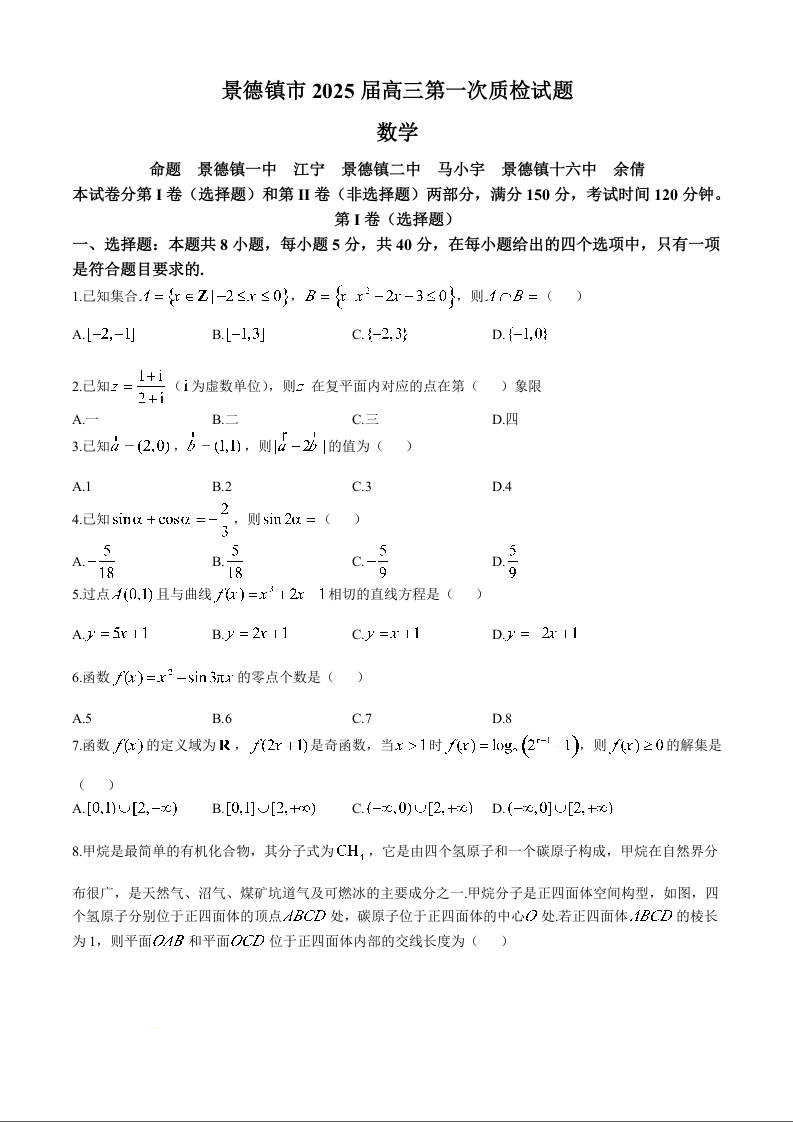 江西省景德镇市2025届高三第一次质量检测数学+答案