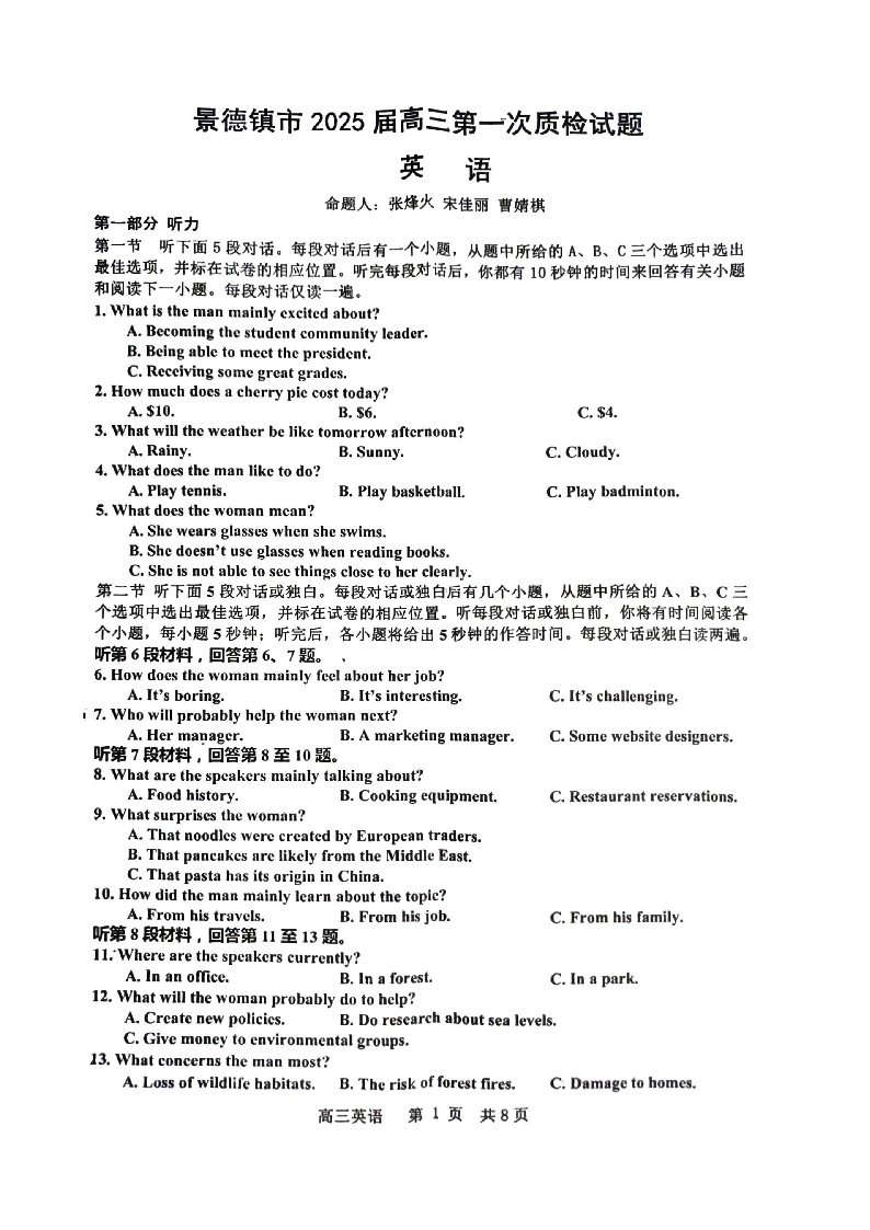 江西省景德镇市2025届高三第一次质量检测英语