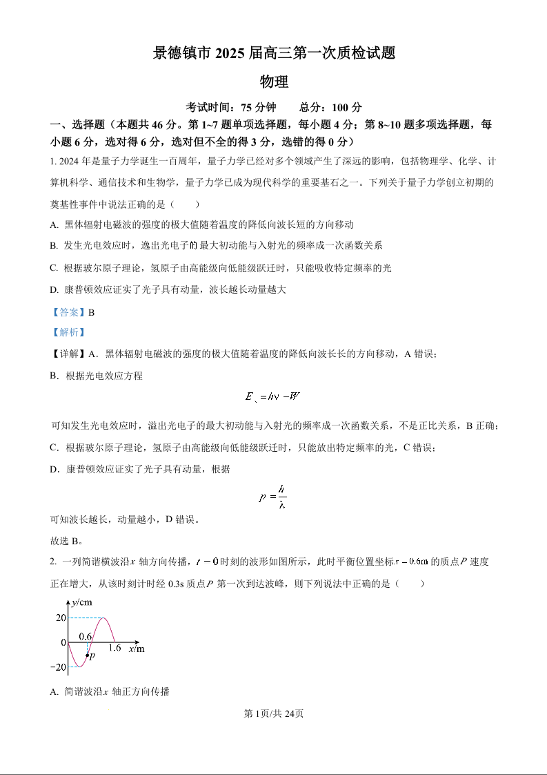 江西省景德镇市2025届高三第一次质量检测物理(精品解析版)
