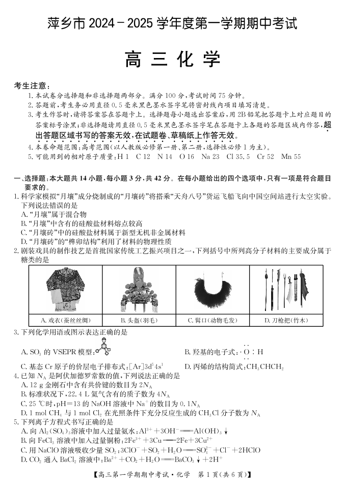 江西省萍乡市2025届高三上学期11月期中考试化学