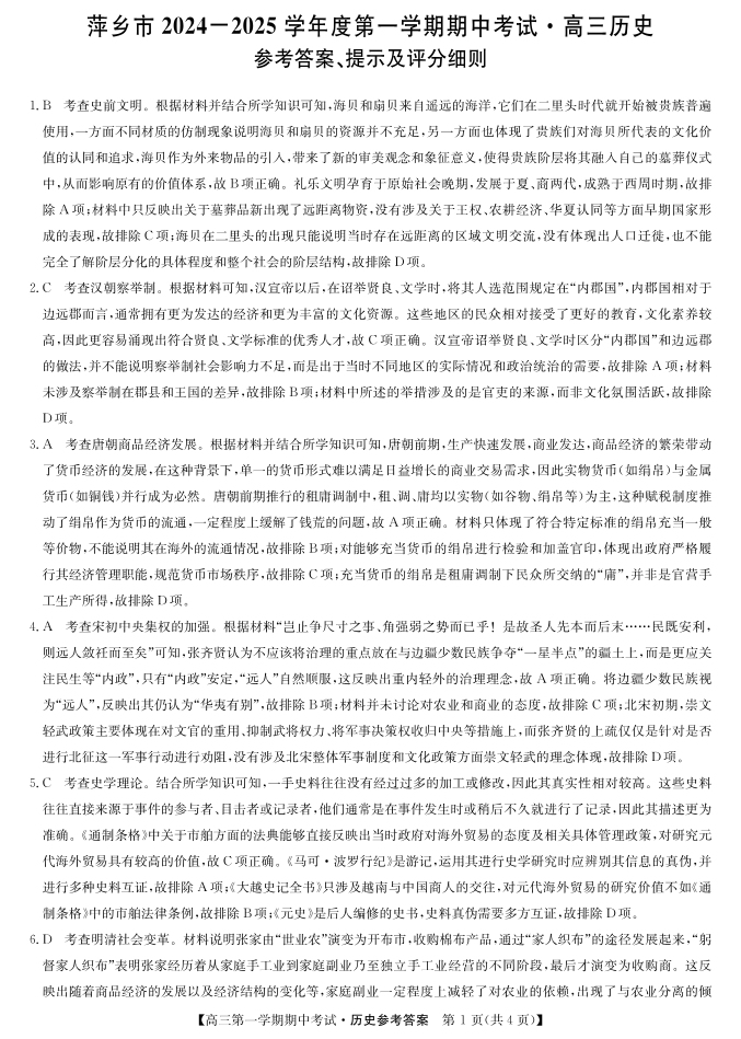 江西省萍乡市2025届高三上学期11月期中考试历史答案