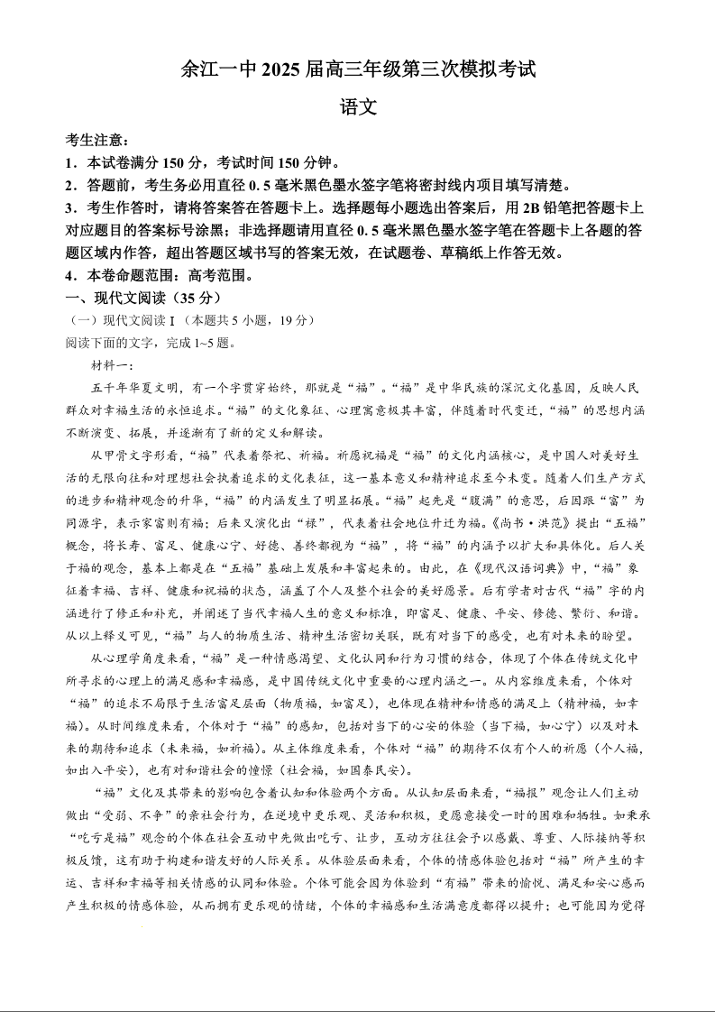 江西省鹰潭市余江区第一中学2025届高三上学期11月期中考试语文+答案