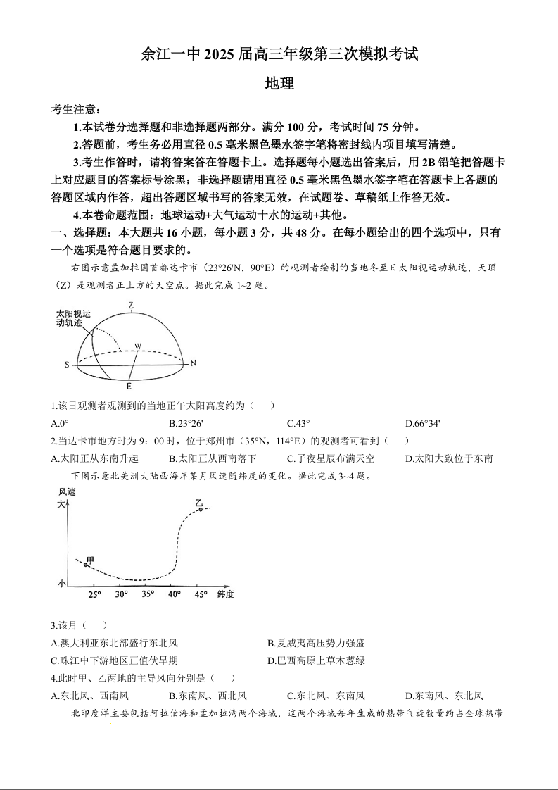 江西省鹰潭市余江区第一中学2025届高三上学期11月期中考试地理+答案