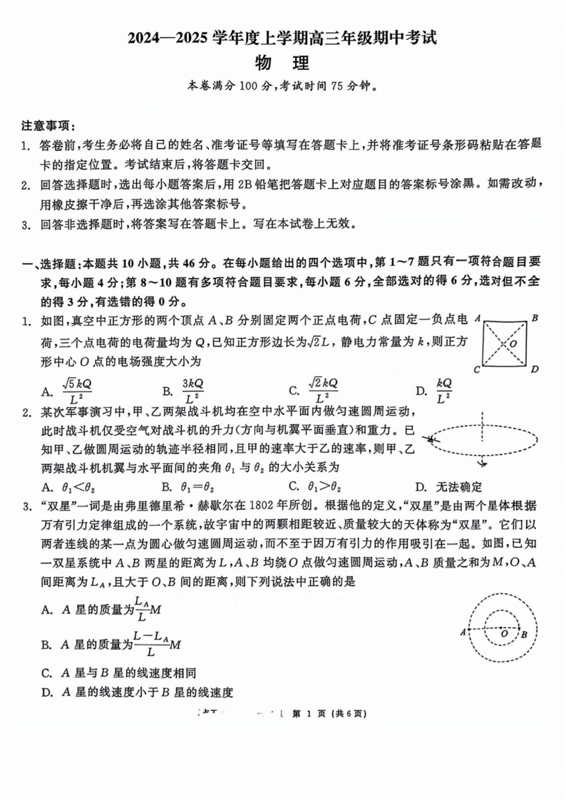 辽宁省点石联考(辽宁县级协作体)2025届上学期高三年级期中考试物理+答案