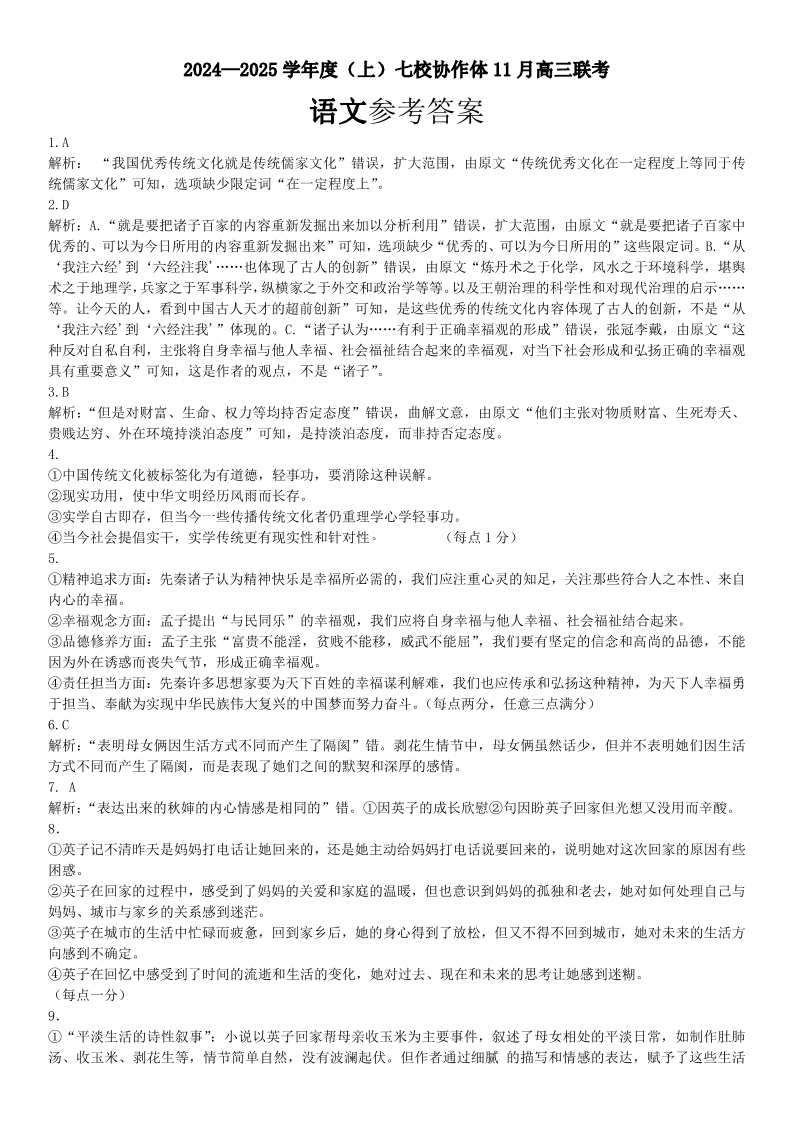 辽宁省七校协作体2025届高三上学期11月期中考试语文答案