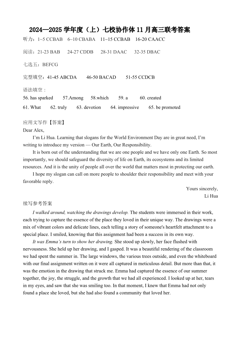辽宁省七校协作体2025届高三上学期11月期中考试英语答案