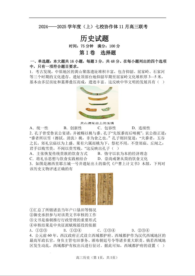辽宁省七校协作体2025届高三上学期11月期中考试历史