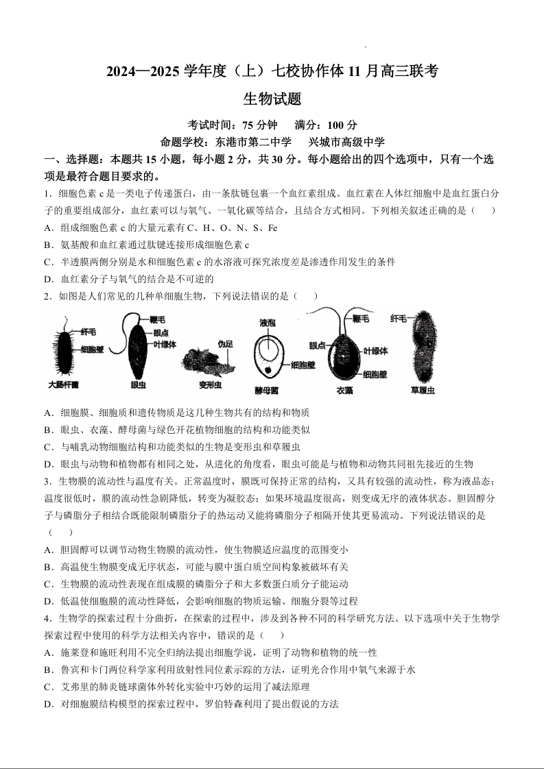 辽宁省七校协作体2025届高三上学期11月期中考试生物+答案