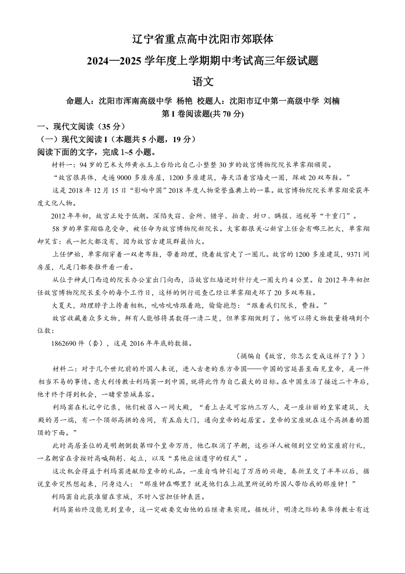 辽宁省沈阳市郊联体2025届上学期11月期中期中考试语文+答案