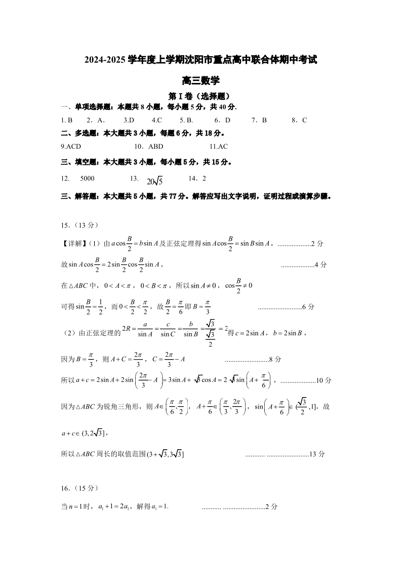 辽宁省沈阳市郊联体2025届上学期11月期中期中考试数学答案