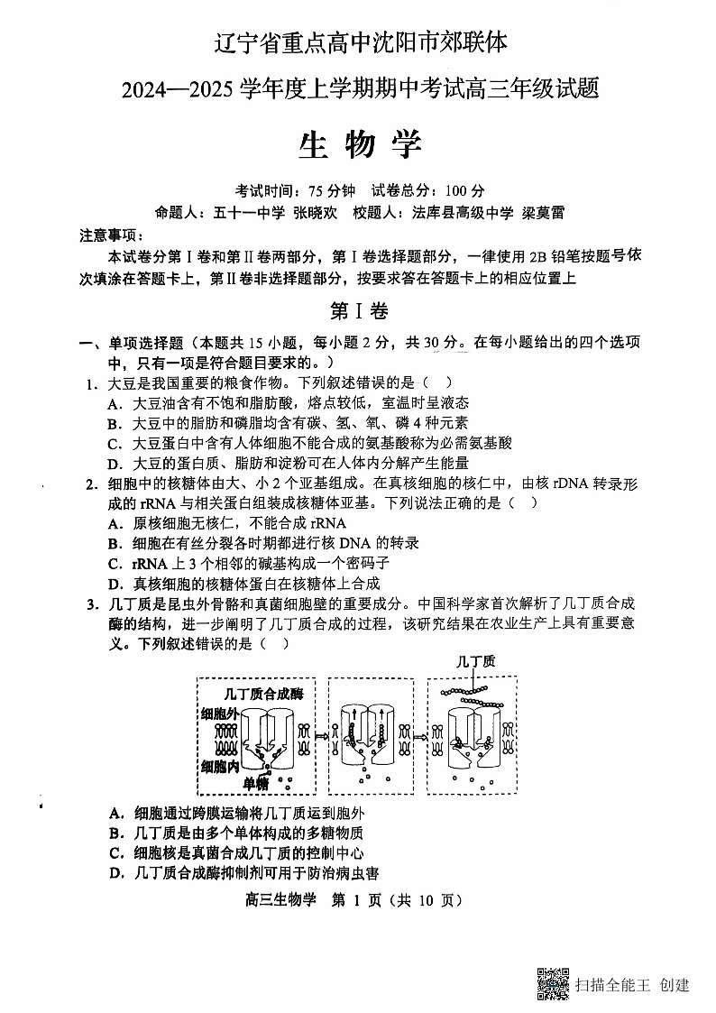 辽宁省沈阳市郊联体2025届上学期11月期中期中考试生物+答案
