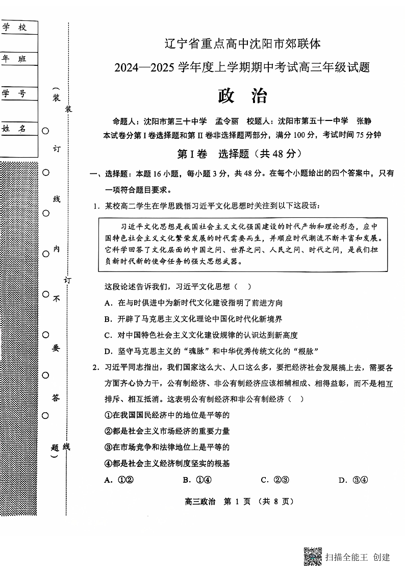 辽宁省沈阳市郊联体2025届上学期11月期中期中考试政治+答案