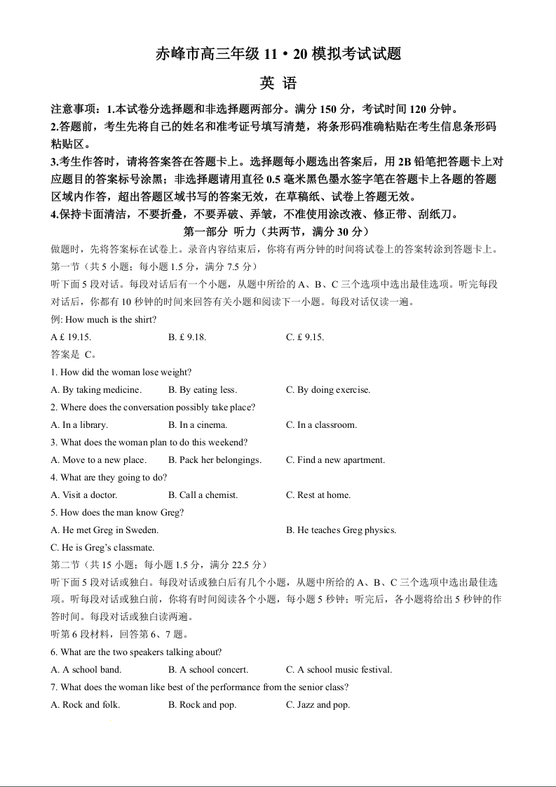 内蒙古自治区赤峰市2025届高三上学期11月期中考试英语