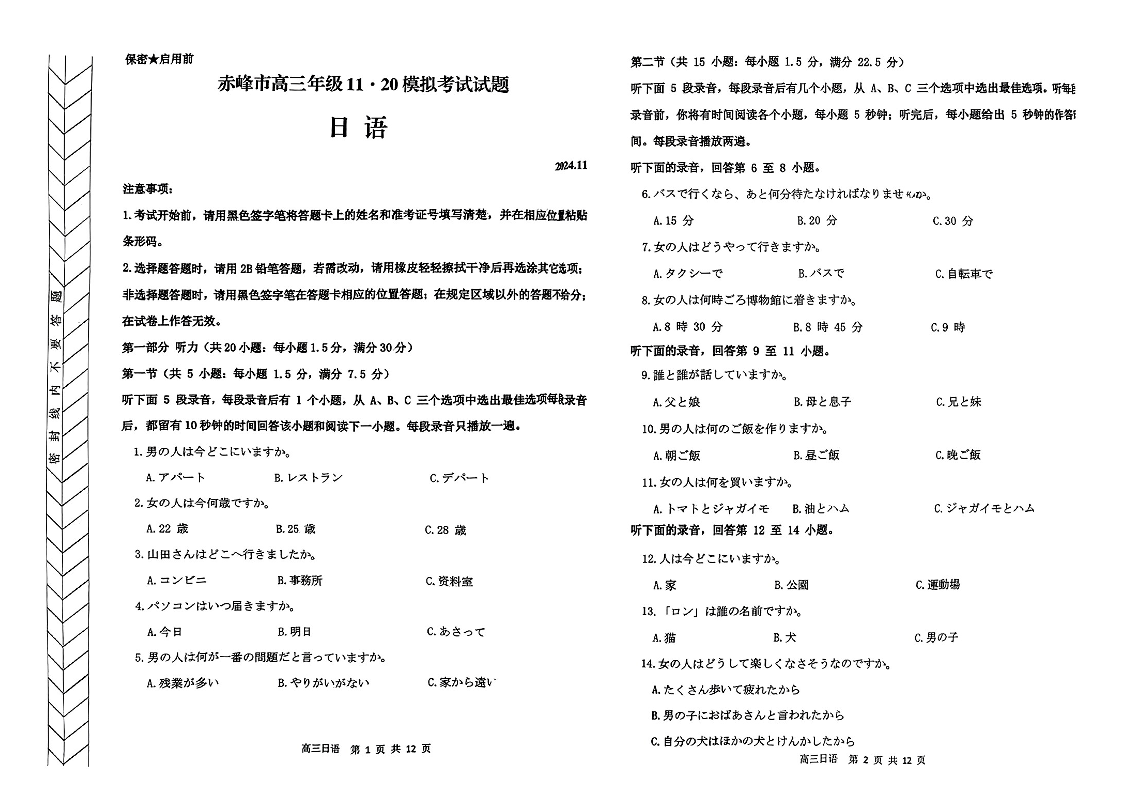 内蒙古自治区赤峰市2025届高三上学期11月期中考试日语