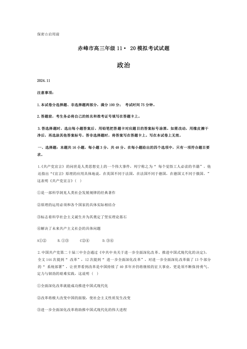 内蒙古自治区赤峰市2025届高三上学期11月期中考试政治