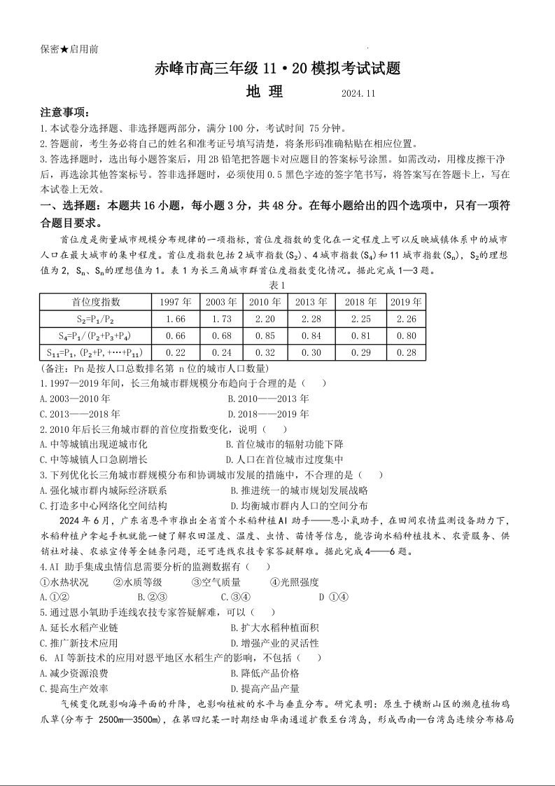 内蒙古自治区赤峰市2025届高三上学期11月期中考试地理+答案