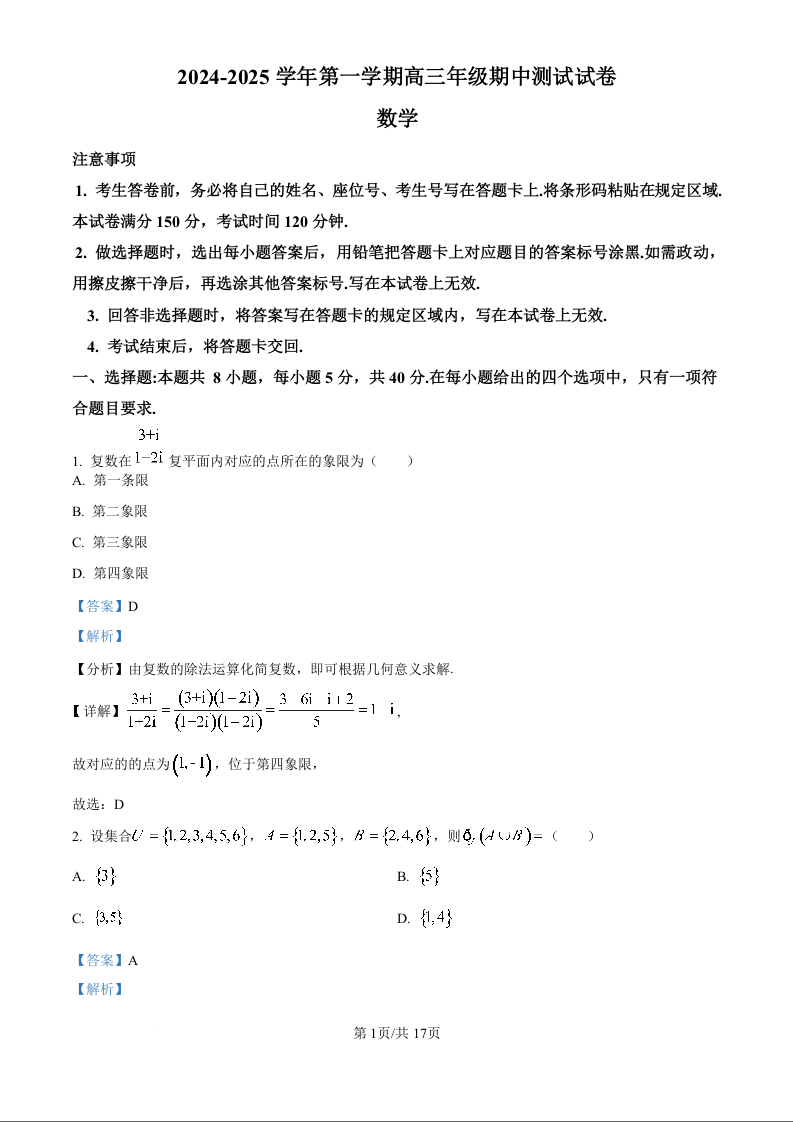 内蒙古自治区锡林郭勒盟2025届高三上学期11月期中考试数学(精品解析版)