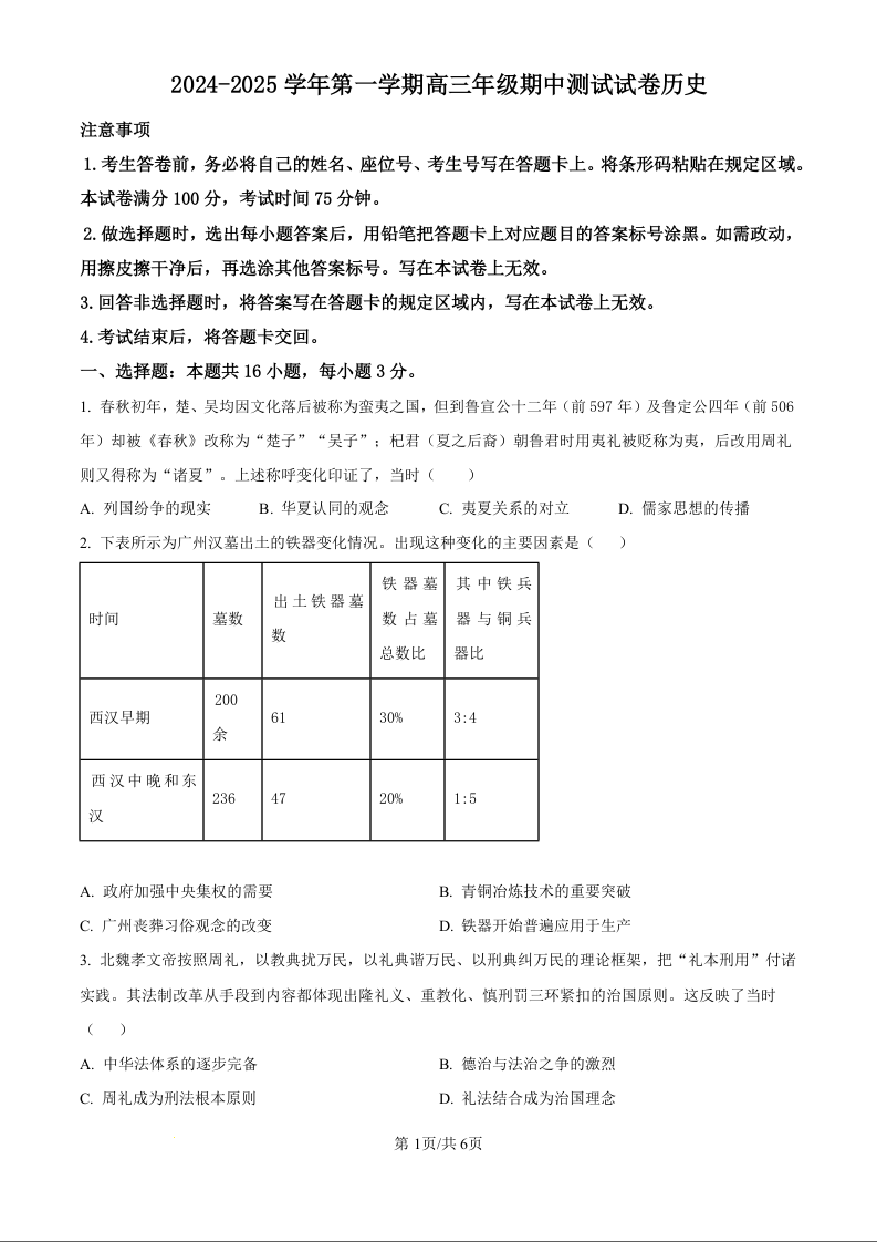 内蒙古自治区锡林郭勒盟2025届高三上学期11月期中考试历史(原卷版)