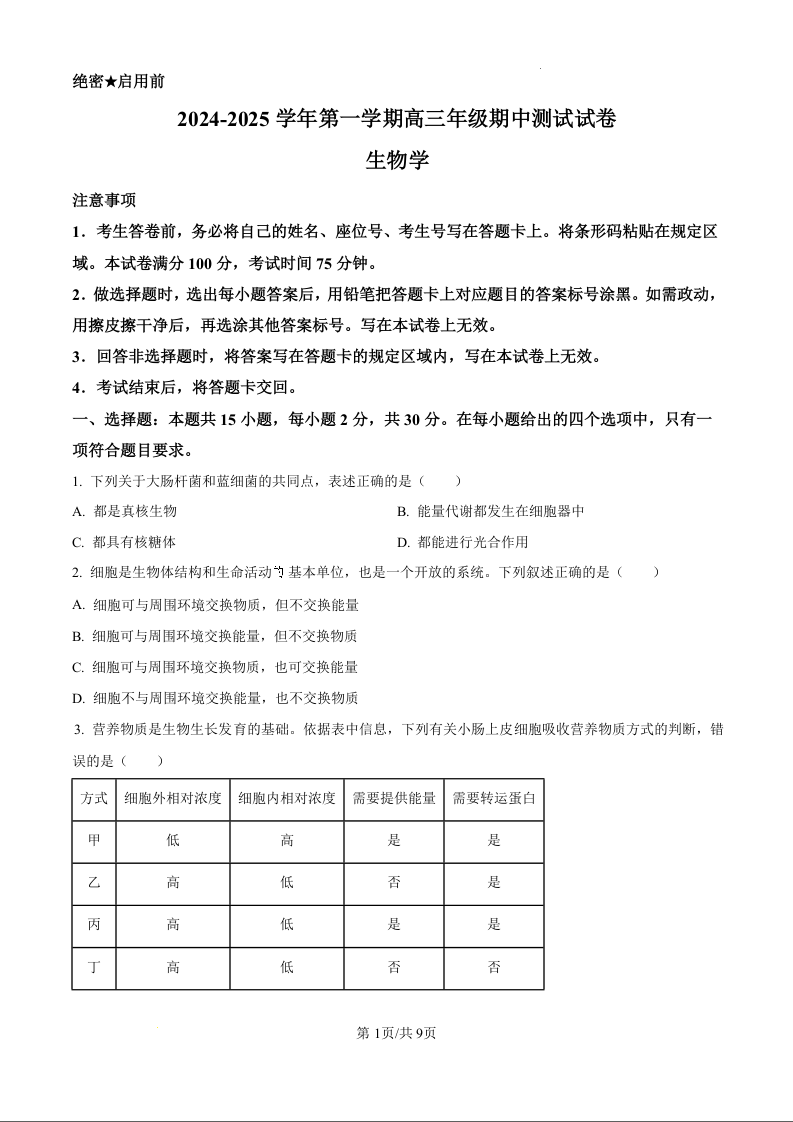 内蒙古自治区锡林郭勒盟2025届高三上学期11月期中考试生物(原卷版)