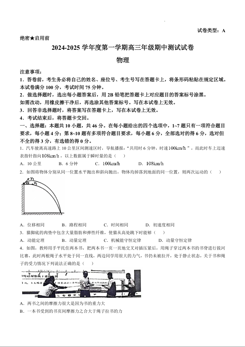 内蒙古自治区锡林郭勒盟2025届高三上学期11月期中考试物理