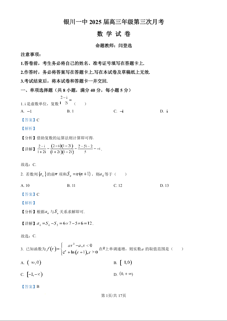 宁夏回族自治区银川一中2025届高三上学期第三次月考数学(精品解析版)