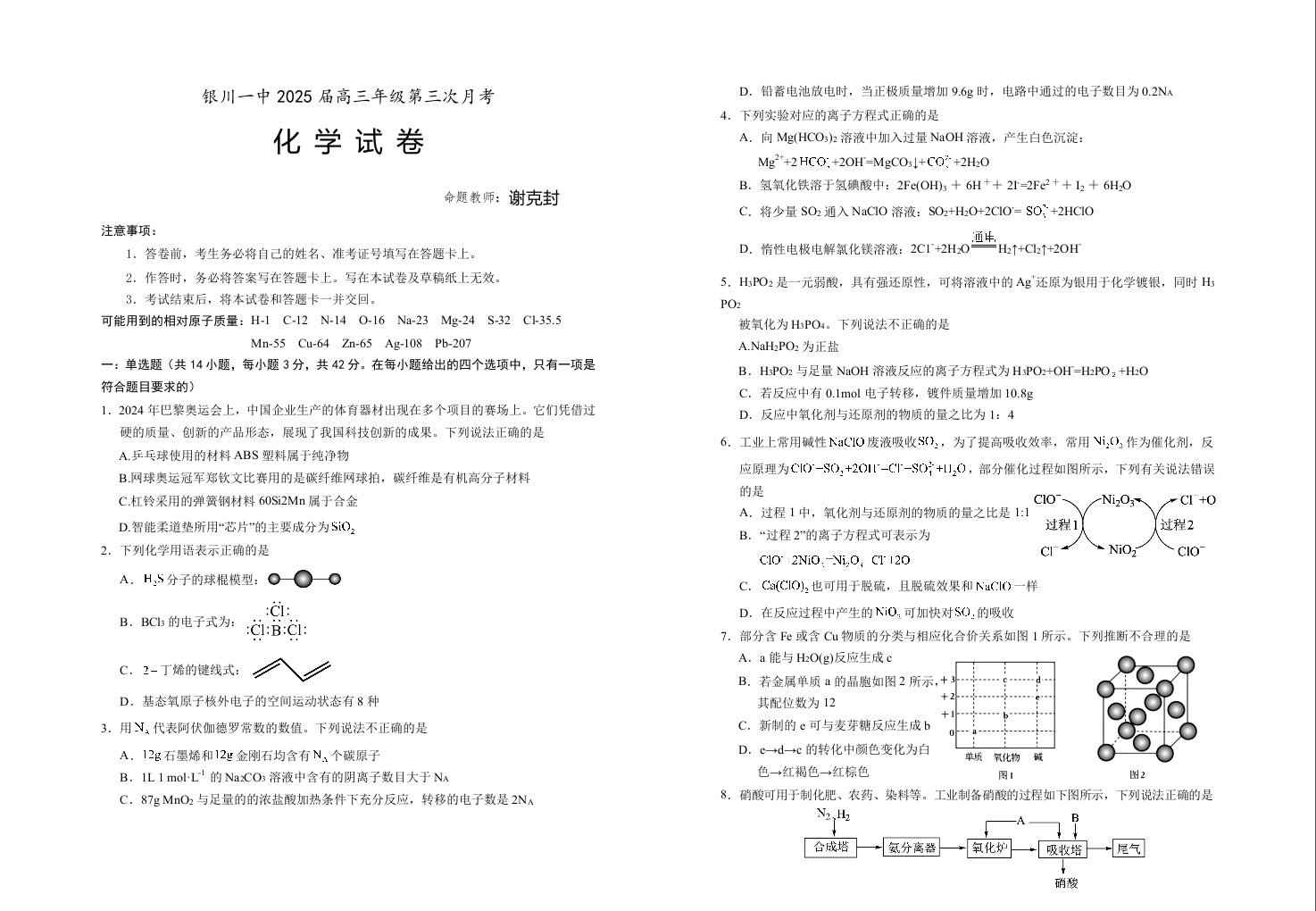 宁夏回族自治区银川一中2025届高三上学期第三次月考化学+答案