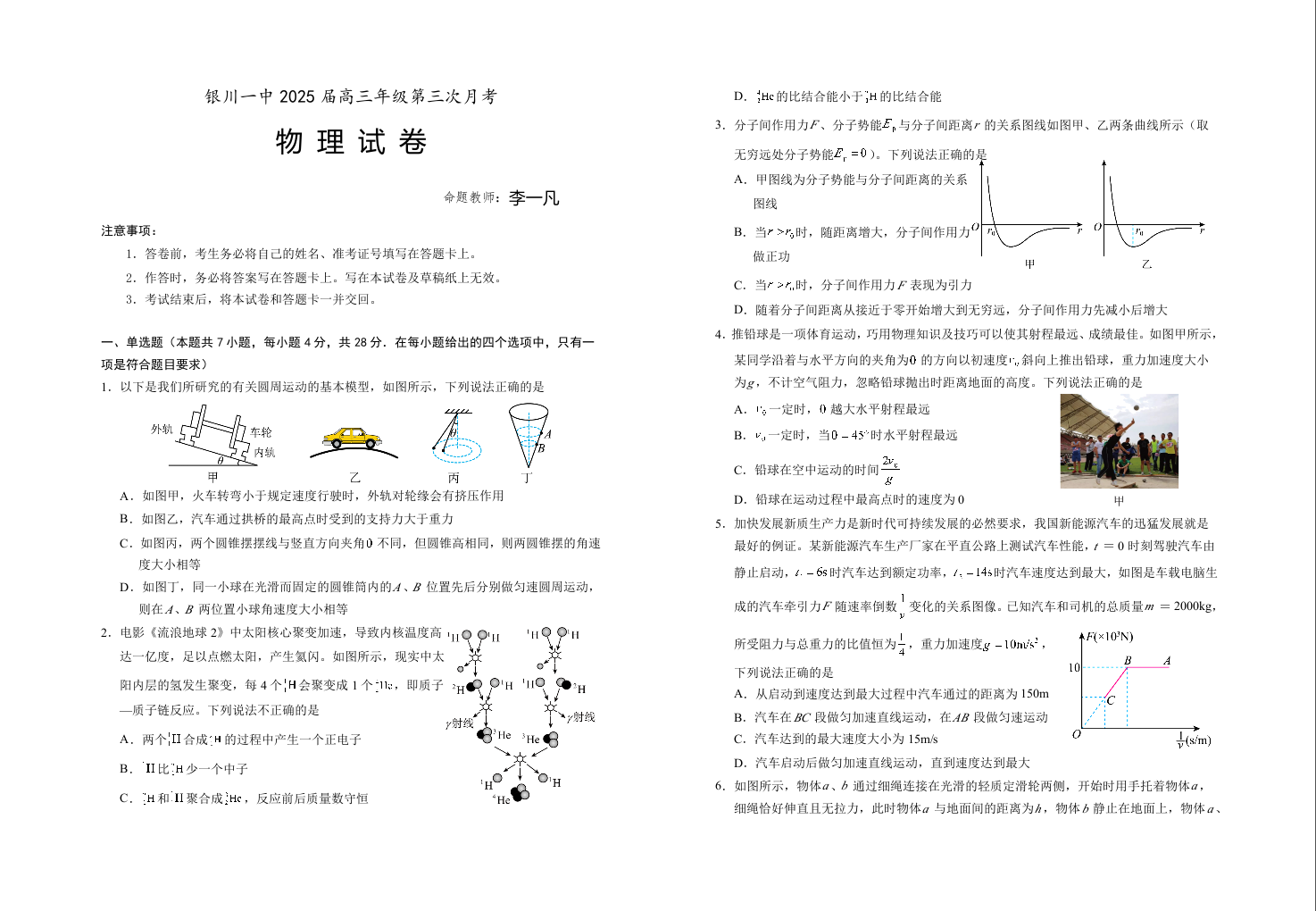 宁夏回族自治区银川一中2025届高三上学期第三次月考物理+答案
