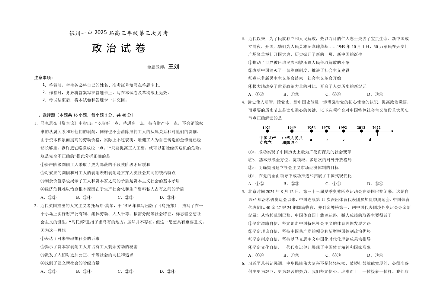 宁夏回族自治区银川一中2025届高三上学期第三次月考政治+答案