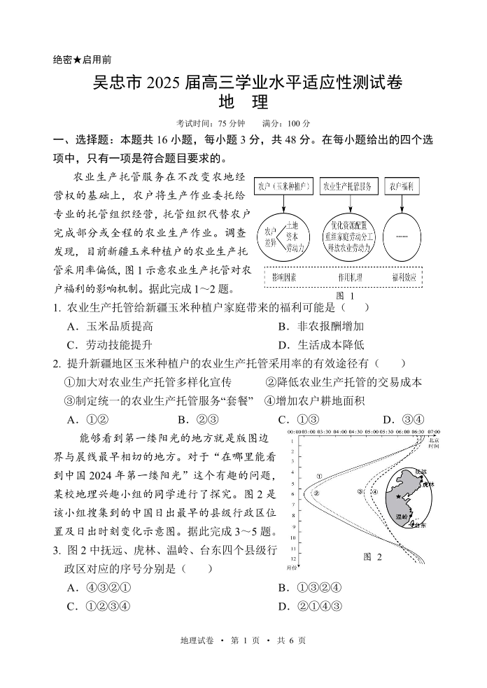 宁夏回族自治区吴忠市高三上学期11月学业水平适应性考试地理