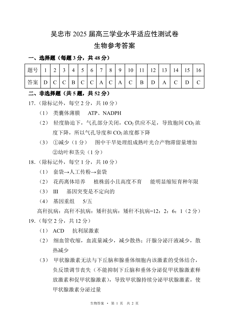 宁夏回族自治区吴忠市高三上学期11月学业水平适应性考试生物答案