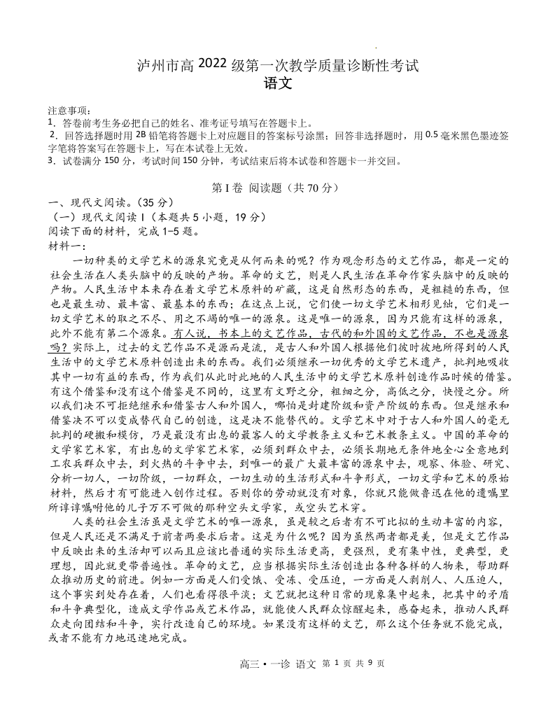 四川省泸州市高2022级第一次教学质量诊断性考试语文