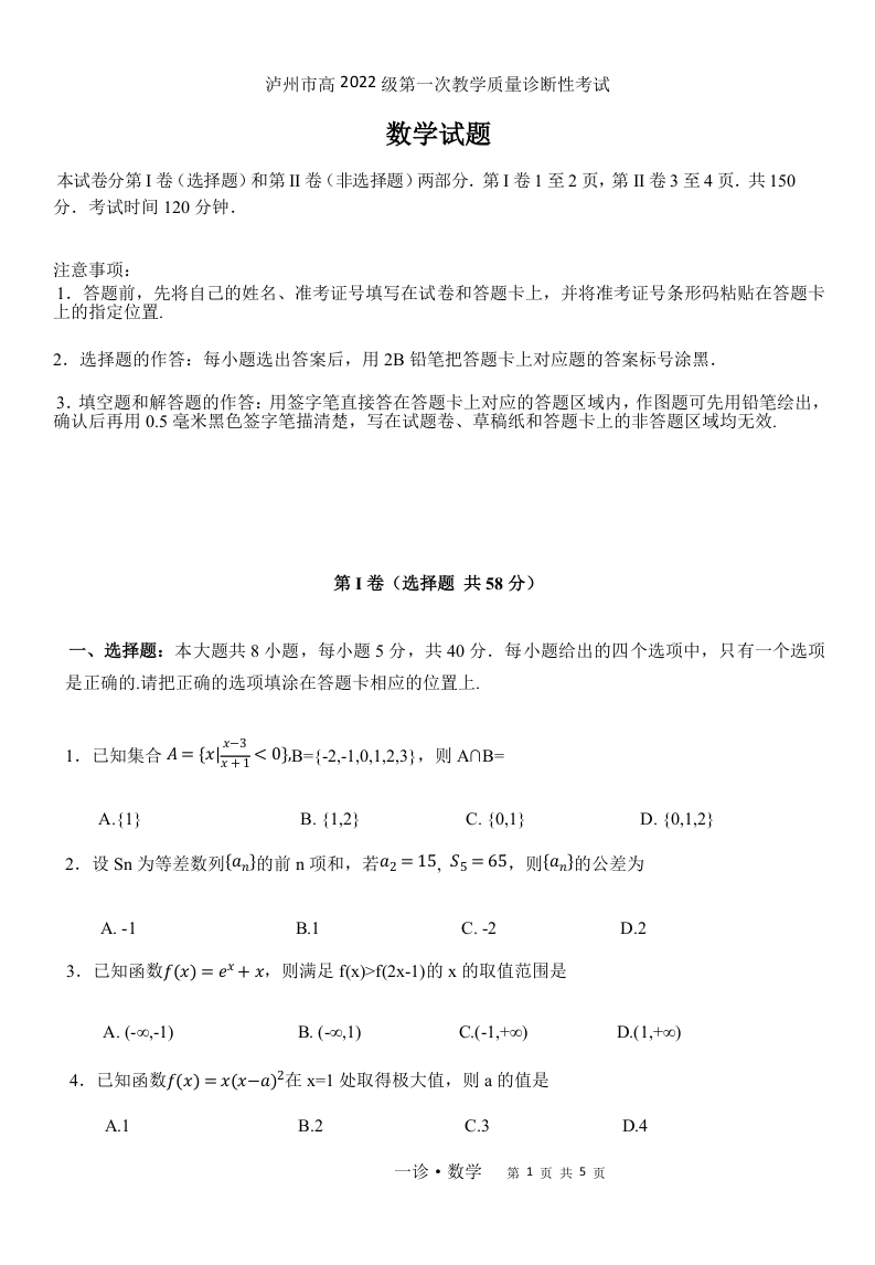 四川省泸州市高2022级第一次教学质量诊断性考试数学